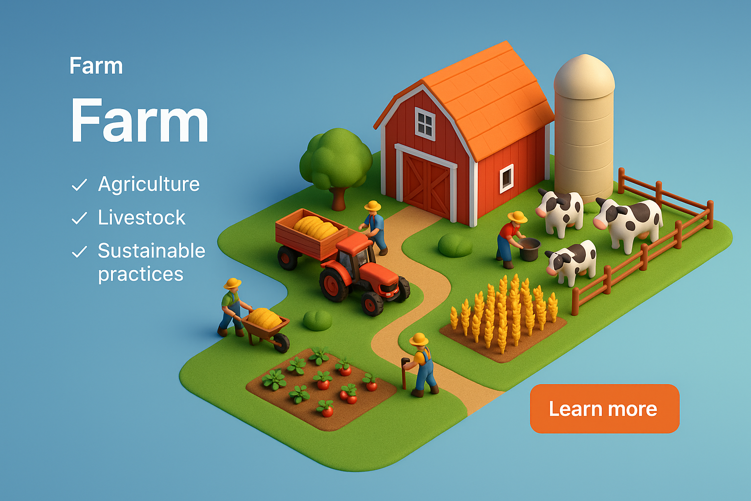 /Collection: /by davooda/Type: PNG/A vibrant 3D illustration of a farm scene featuring crops, livestock, and farmworkers. The design includes a barn, tractor, and various agricultural elements, all set against a smooth gradient background.