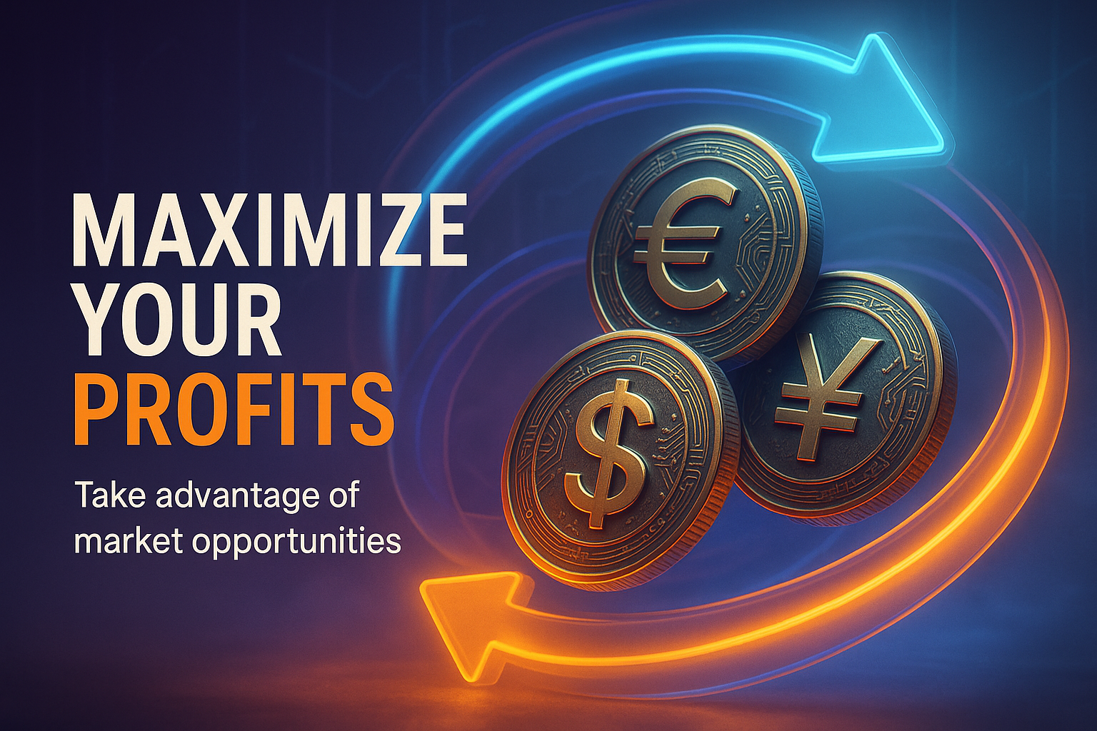 /Collection: /by davooda/Type: PNG/Dynamic promotional graphic emphasizing profit maximization through market opportunities, featuring currency symbols and a modern design, ideal for financial services marketing.