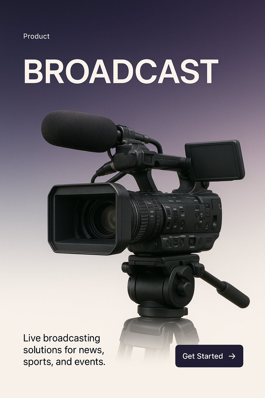A modern web page design featuring a professional camera, highlighting broadcast solutions for news, sports, and events. Includes a call-to-action button.