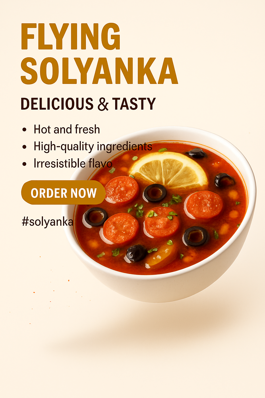 Appealing promotional graphic showcasing a bowl of Solyanka soup with vibrant colors and appetizing presentation, ideal for food marketing campaigns.