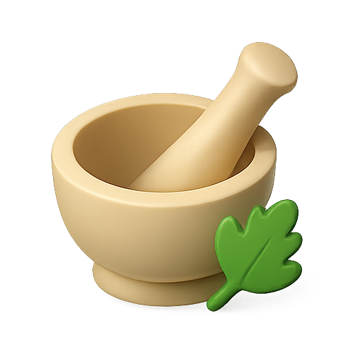A minimalist illustration of a mortar and pestle accompanied by a green leaf, ideal for culinary or herbal themes. The clean design is suitable for use in health, cooking, or wellness-related projects.