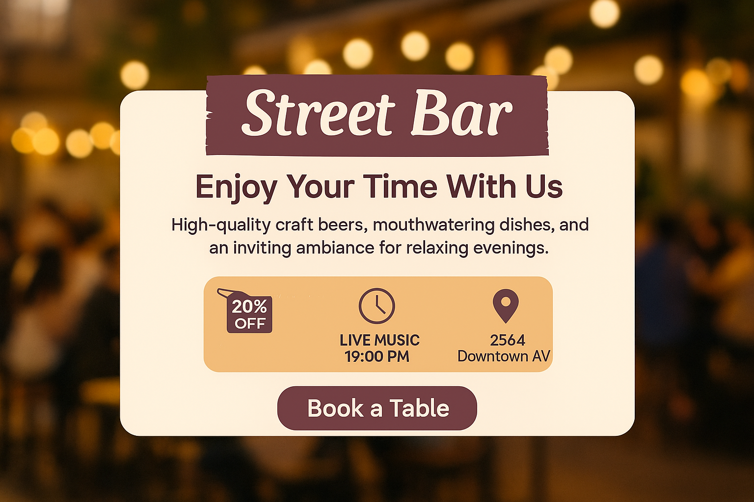 A cozy scene at the Street Bar featuring a warm bokeh background. The inviting atmosphere showcases a promotional design for craft beers and live music.