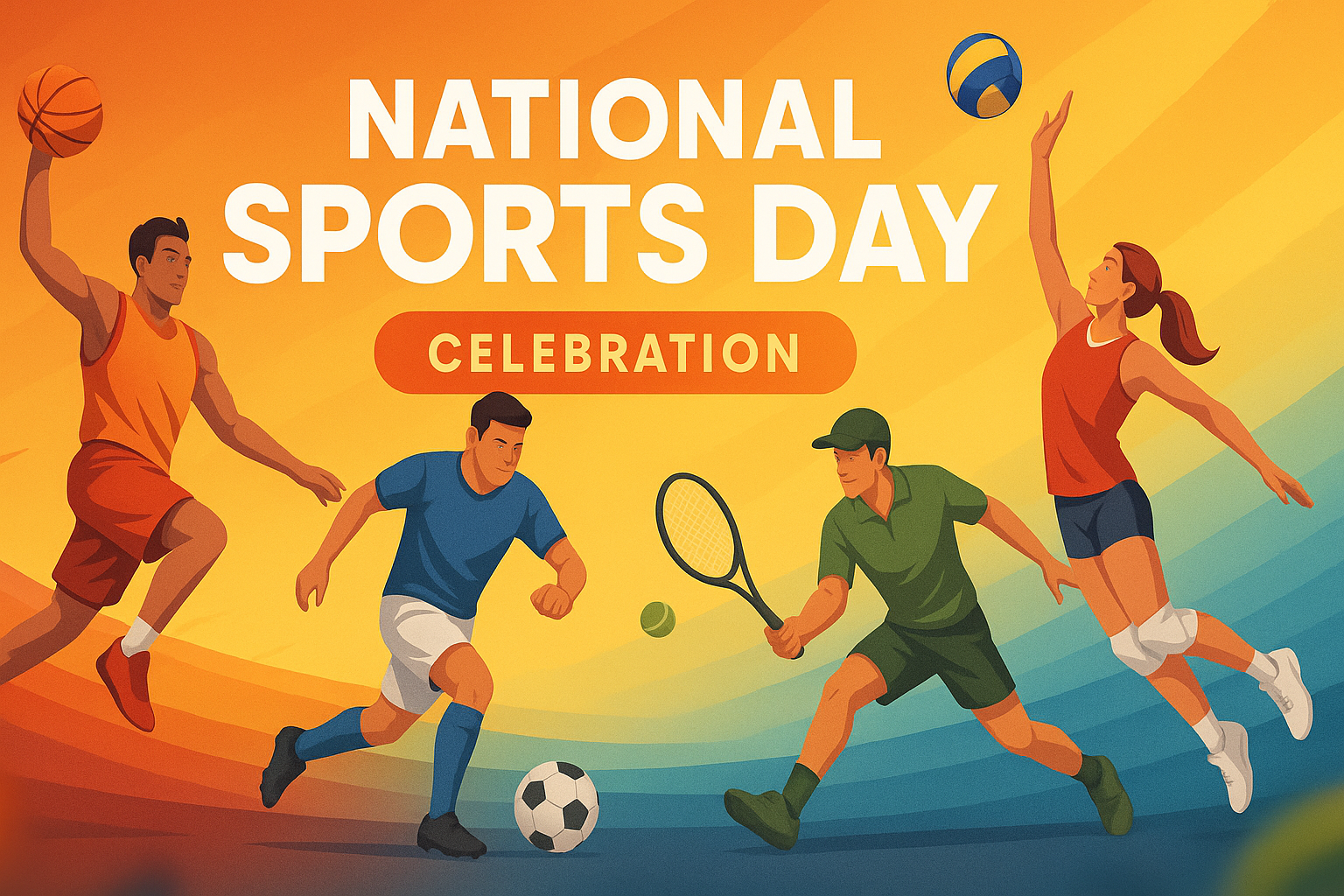 Colorful graphic illustration depicting various athletes celebrating National Sports Day. Ideal for promoting sports events or community activities.