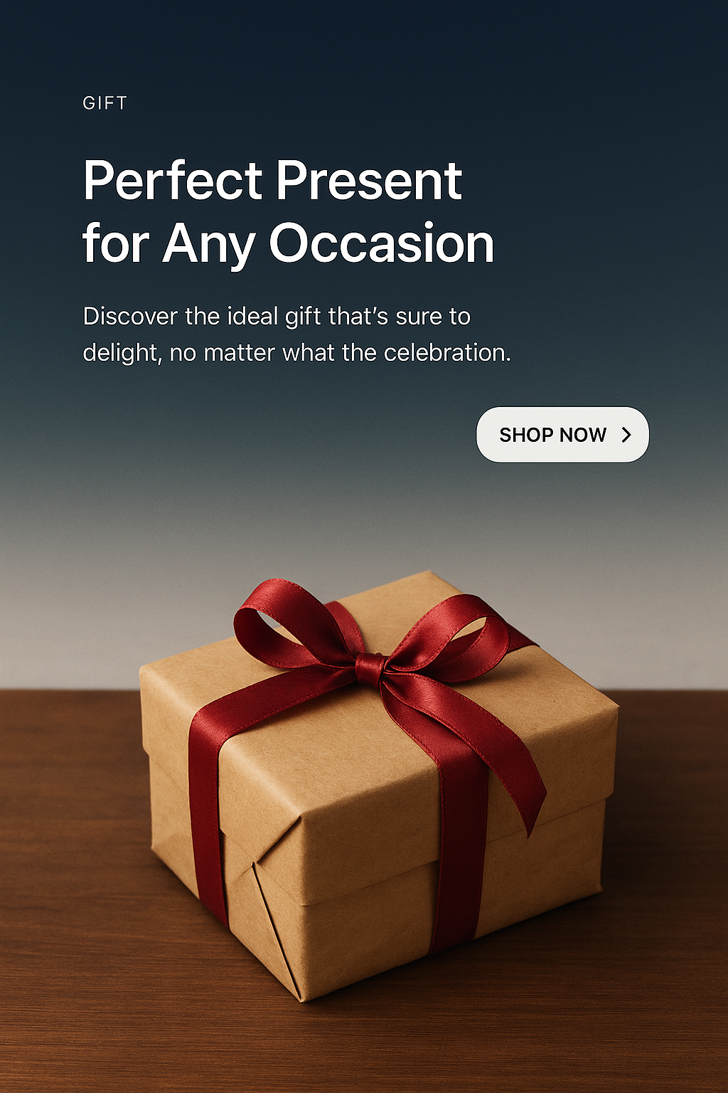 /Collection: /by davooda/Type: PNG/A beautifully wrapped gift box with a red ribbon sits on a wooden surface. The background features a smooth gradient transitioning from dark to light, enhancing the text that invites viewers to discover the perfect gift.