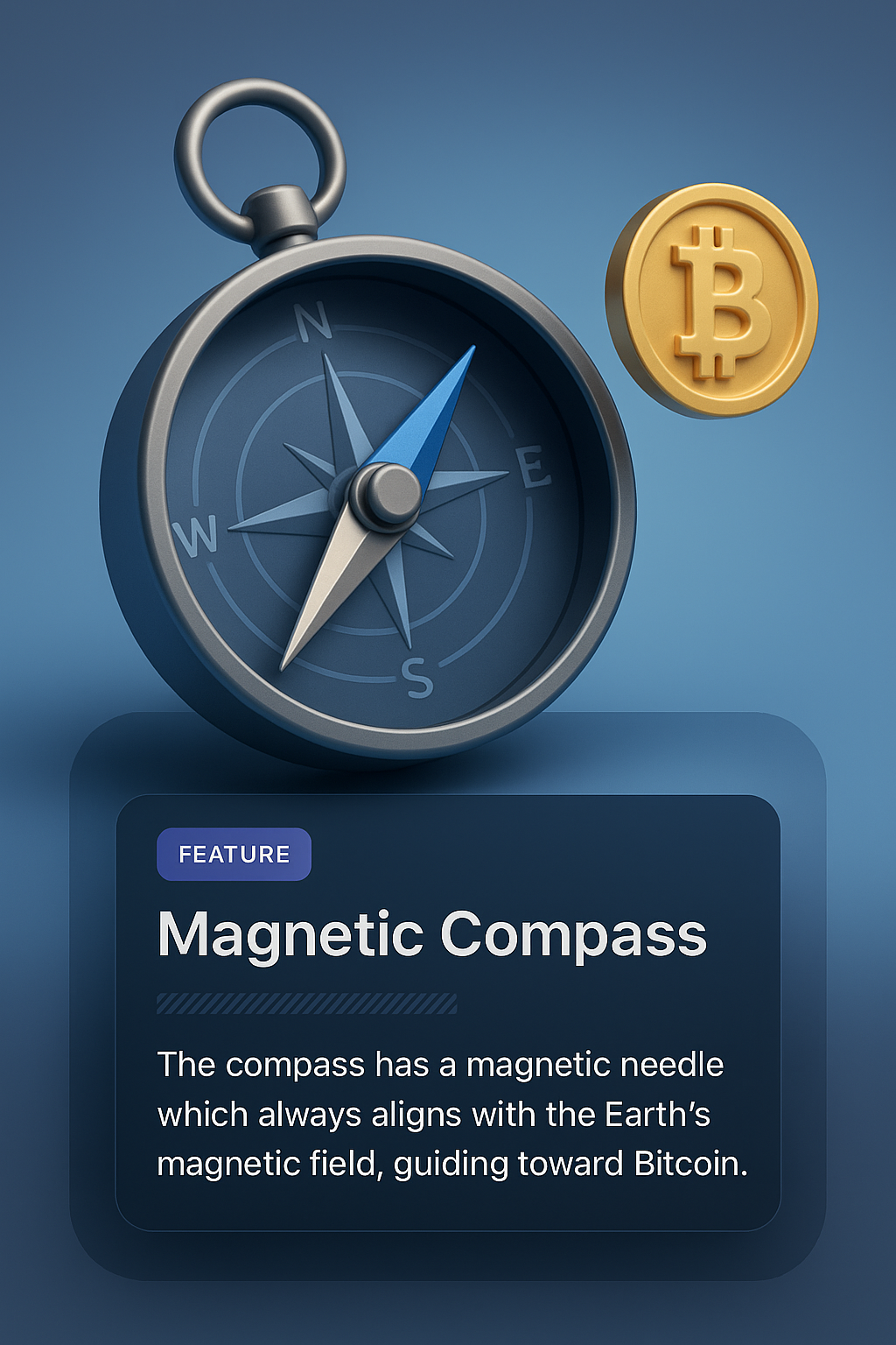 /Collection: /by davooda/Type: PNG/A 3D illustration featuring a magnetic compass with a needle pointing towards a Bitcoin symbol. The design includes a smooth gradient background and a feature block highlighting the compass's functionality.