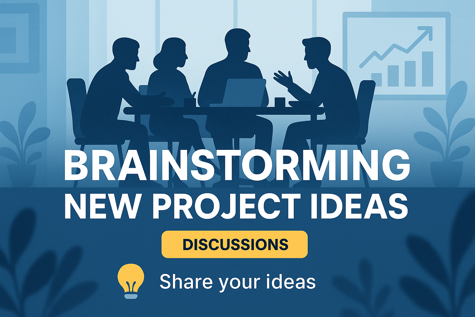 An engaging illustration depicting a group of individuals in a brainstorming session. The design features silhouettes against a blue backdrop, making it suitable for discussions around project ideas.