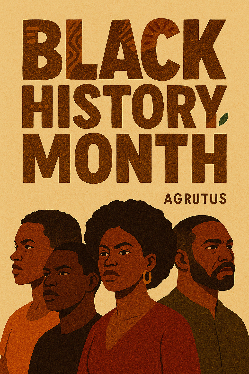 Illustrative graphic celebrating Black History Month, featuring diverse figures with a bold color palette, suitable for educational campaigns and social awareness.