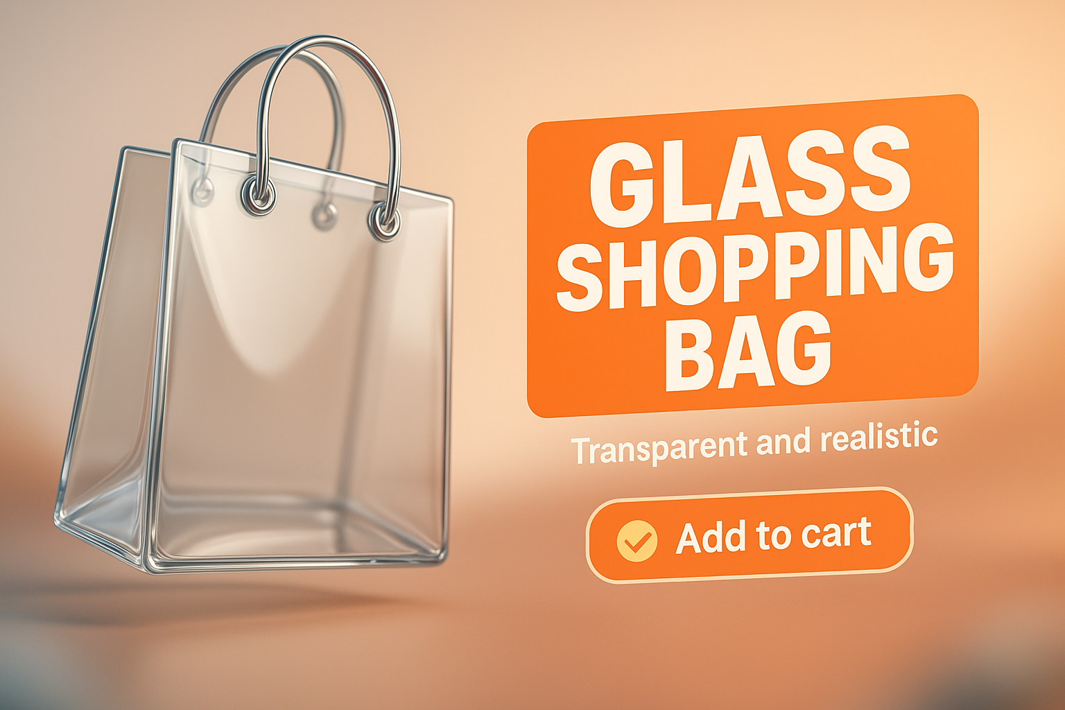 A modern graphic showcasing a transparent glass shopping bag, designed with a minimalist aesthetic. Ideal for e-commerce platforms and online retail marketing.