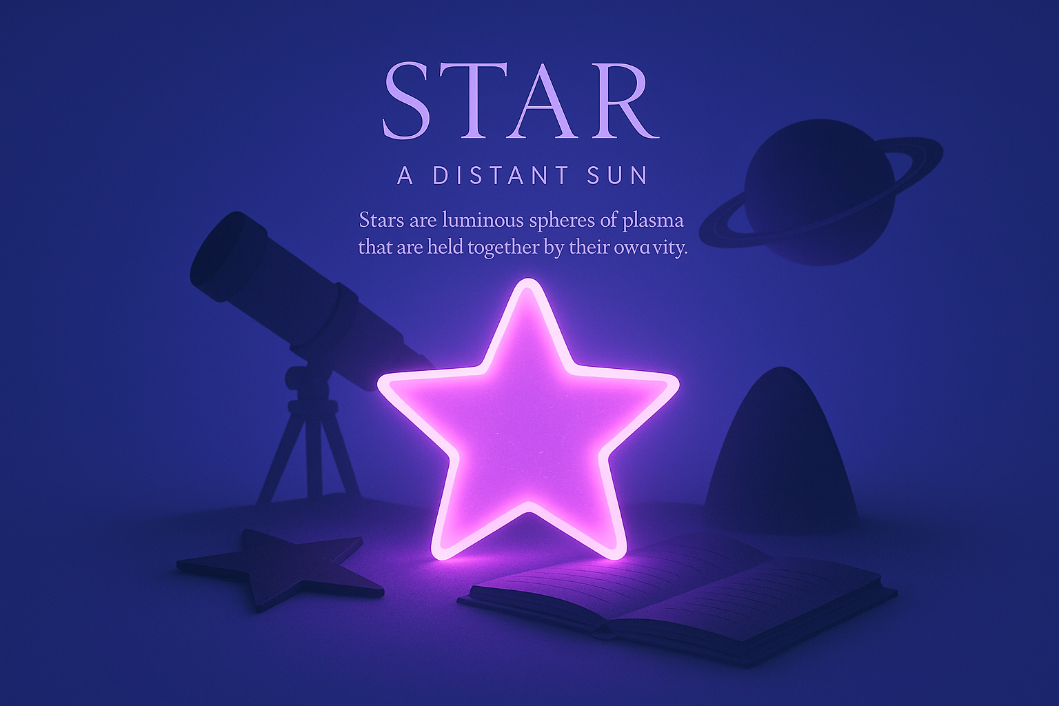 The image features a glowing pink star illuminated against a solid blue background, surrounded by a telescope, an open book, and a planet silhouette, creating a cosmic atmosphere.
