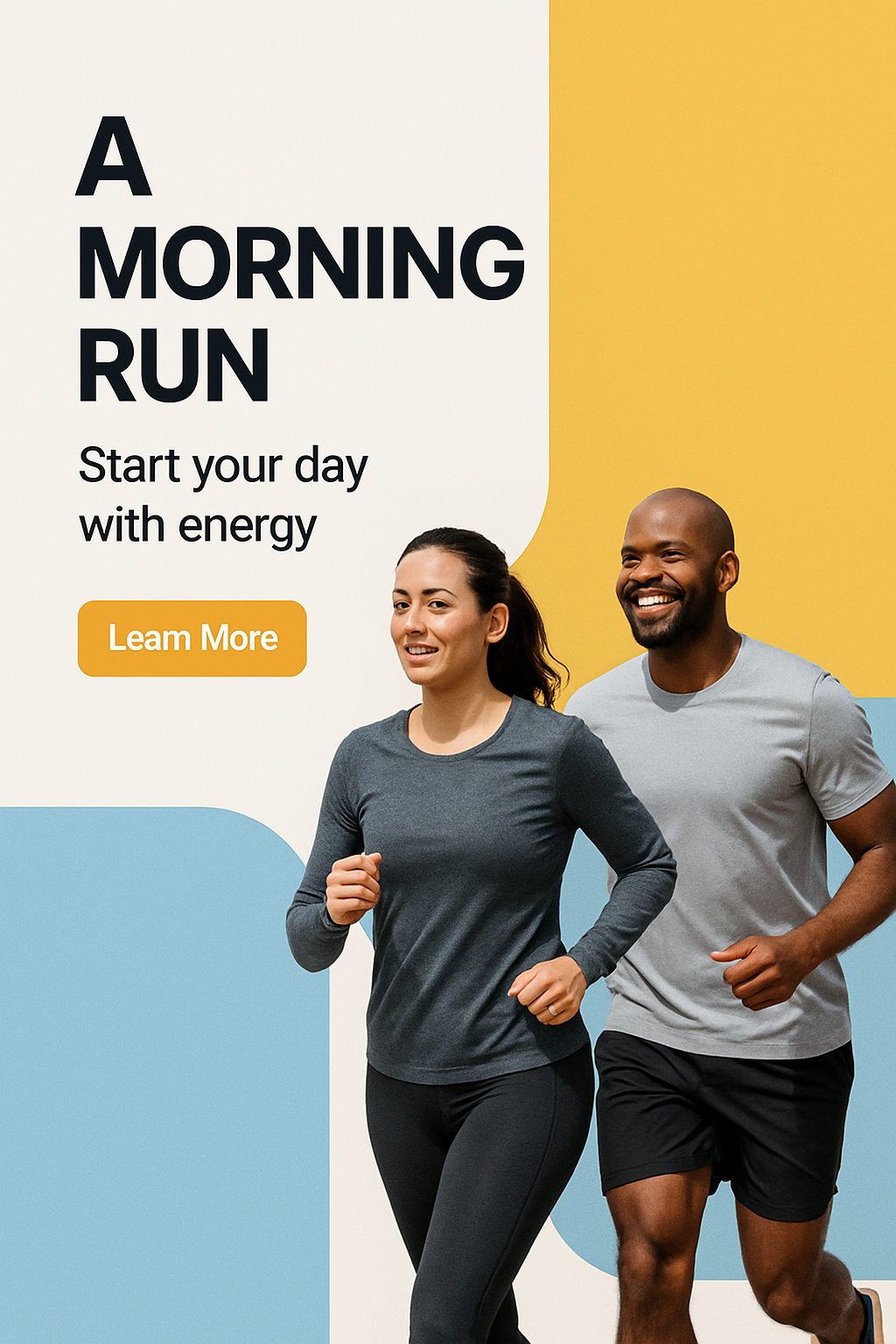 A vibrant image of a couple jogging together in the morning. The background features bright geometric shapes, enhancing the dynamic and fresh feel of the scene. Bold typography complements the energetic atmosphere.