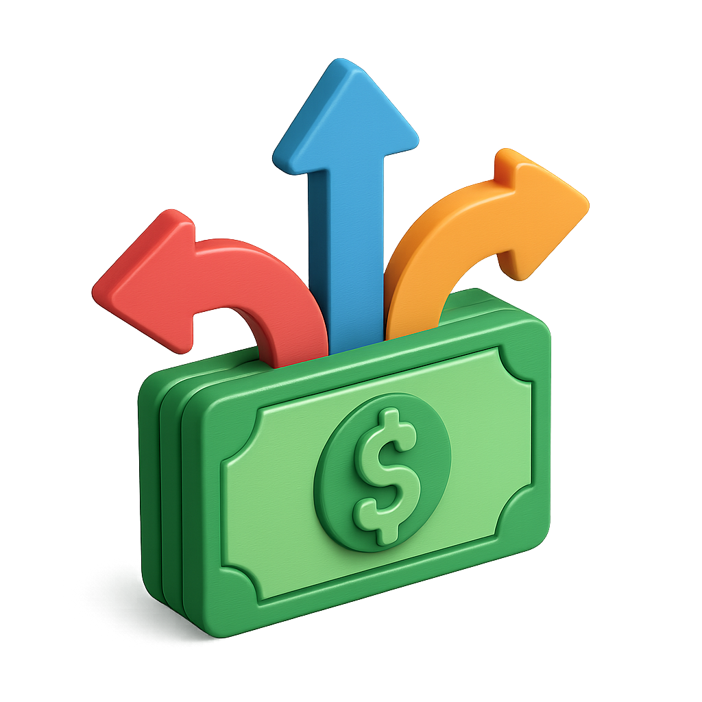 /Collection: /by davooda/Type: PNG/A visually striking 3D icon depicting a stack of money with arrows pointing in various directions, illustrating the concept of money movement. The vibrant colors give it a dynamic look.