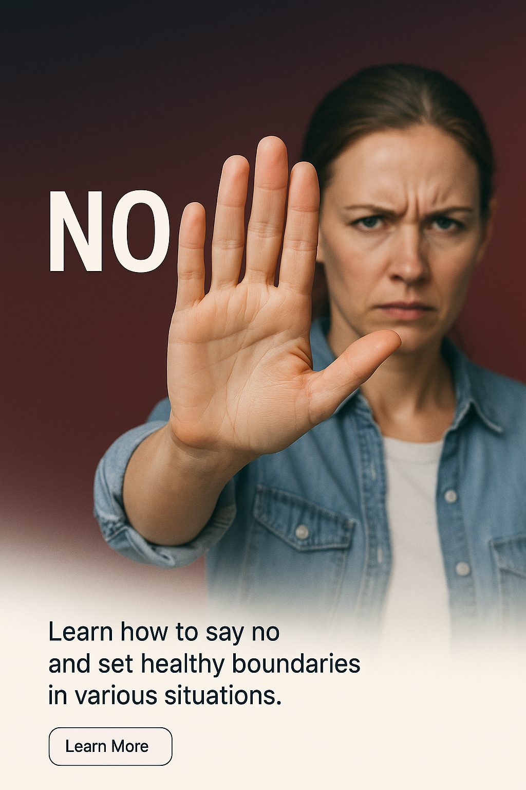A woman with an assertive expression raises her hand, signaling 'no.' Accompanying text emphasizes the importance of setting healthy boundaries in various situations.