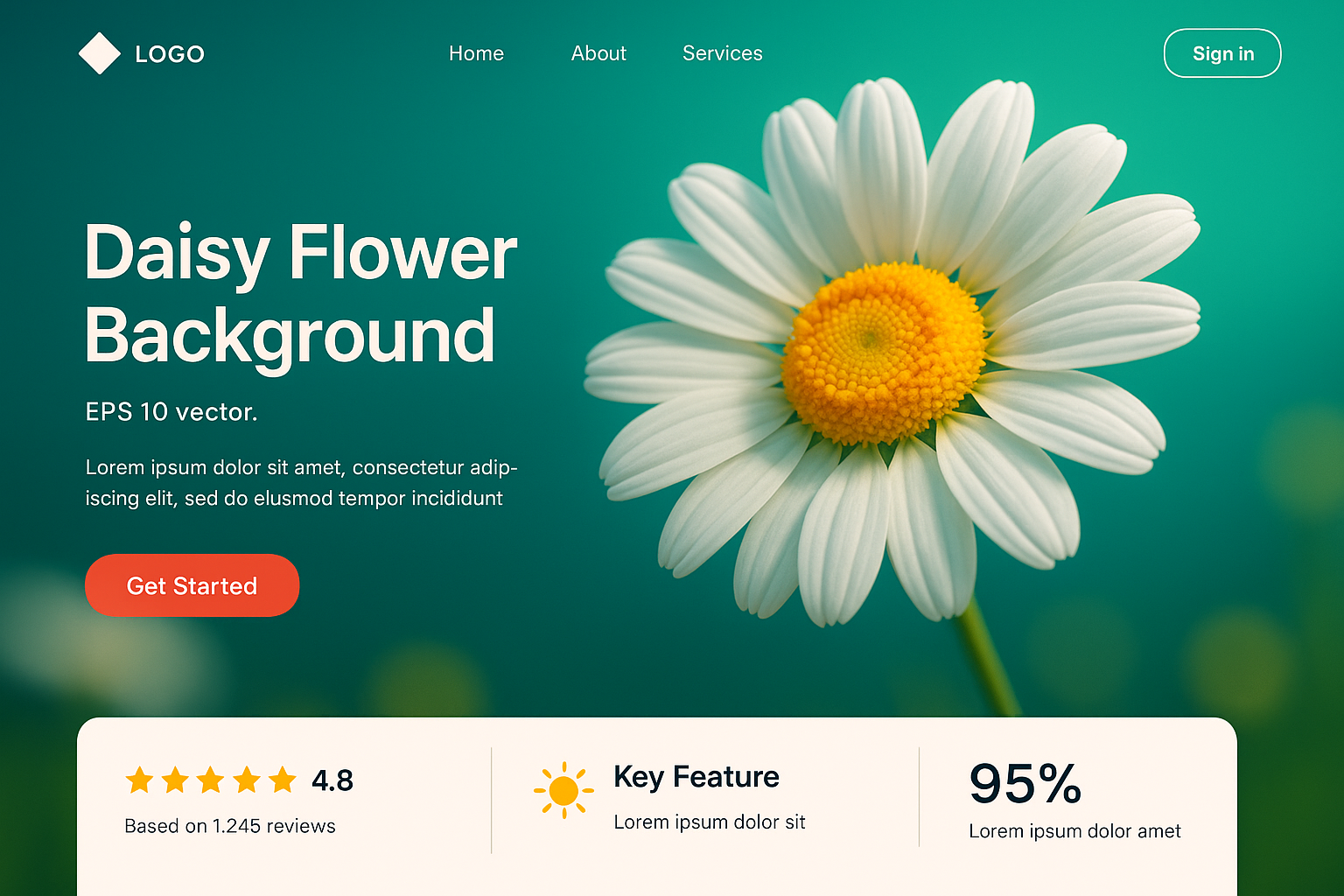 /Collection: /by davooda/Type: PNG/A dynamic landing page design featuring a daisy flower background. The layout includes a logo, a call-to-action button, and sections highlighting features and ratings.