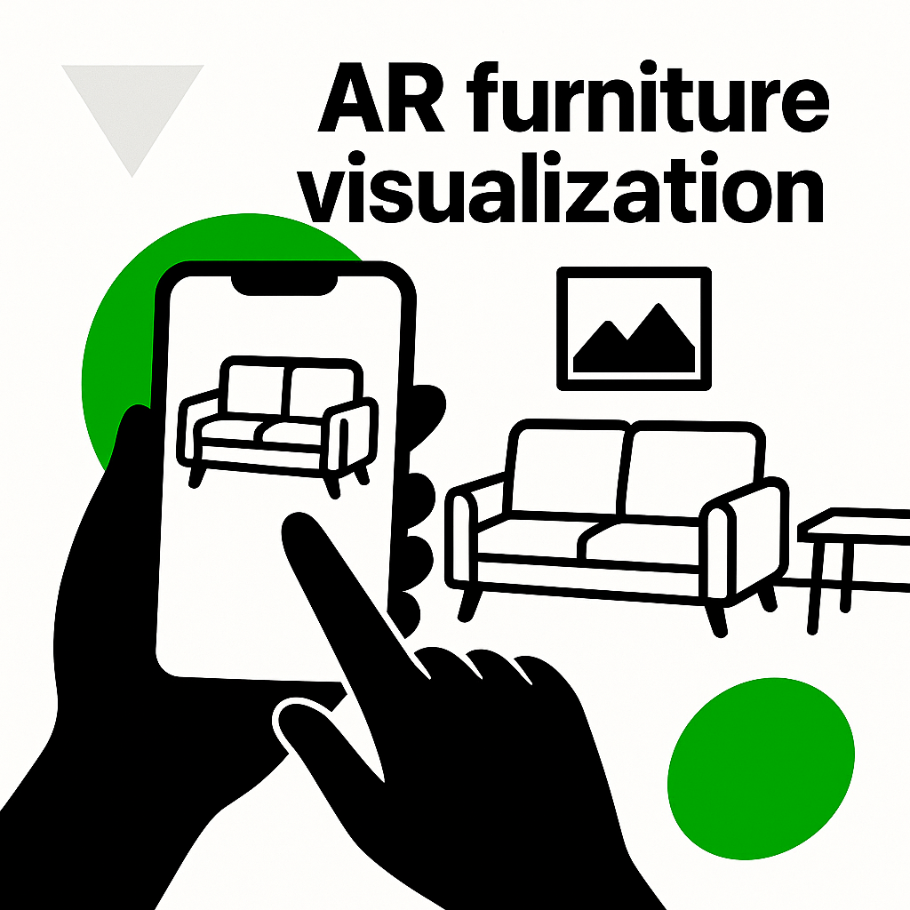 A modern graphic showcasing augmented reality furniture visualization, featuring a smartphone displaying a couch and a minimalist design with bold shapes, ideal for tech and interior design audiences.