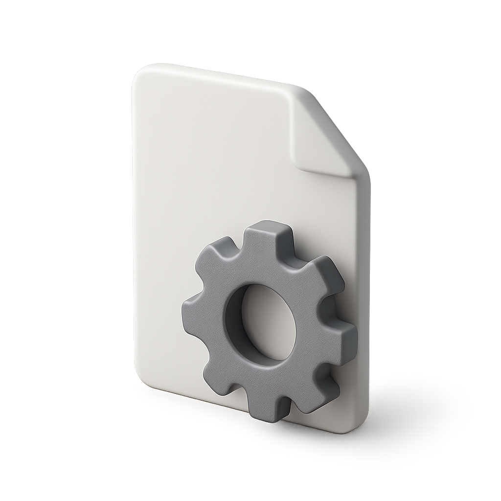 An isometric 3D icon depicting a document with a gear, showcasing a sleek, minimalistic design on a transparent background. The gear adds a mechanical touch to the document's representation.