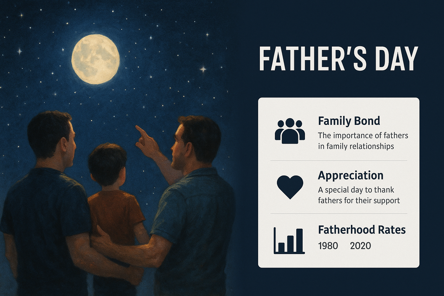 Informative infographic celebrating Father's Day, highlighting family bonds, appreciation, and historical fatherhood rates with a serene night sky backdrop.
