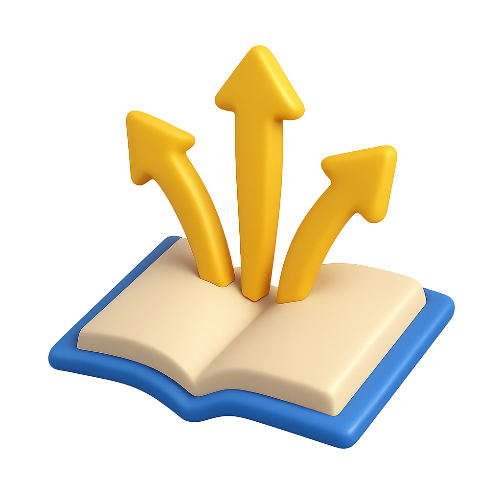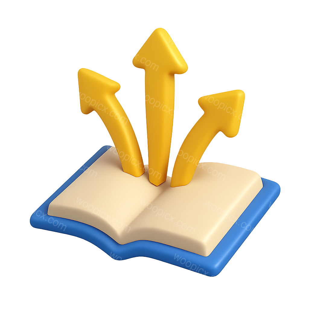 A vibrant 3D icon featuring an open book with three upward arrows emerging from it. The arrows are yellow, symbolizing growth and direction, set against a smooth, gradient background.