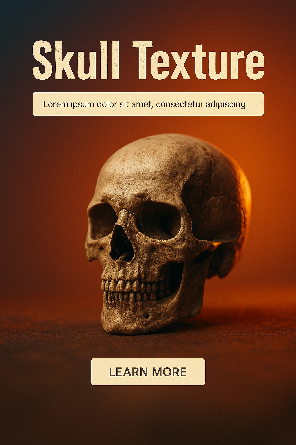 This image features a detailed skull against a gradient background, designed as a promotional graphic. It invites viewers to explore more about skull textures.