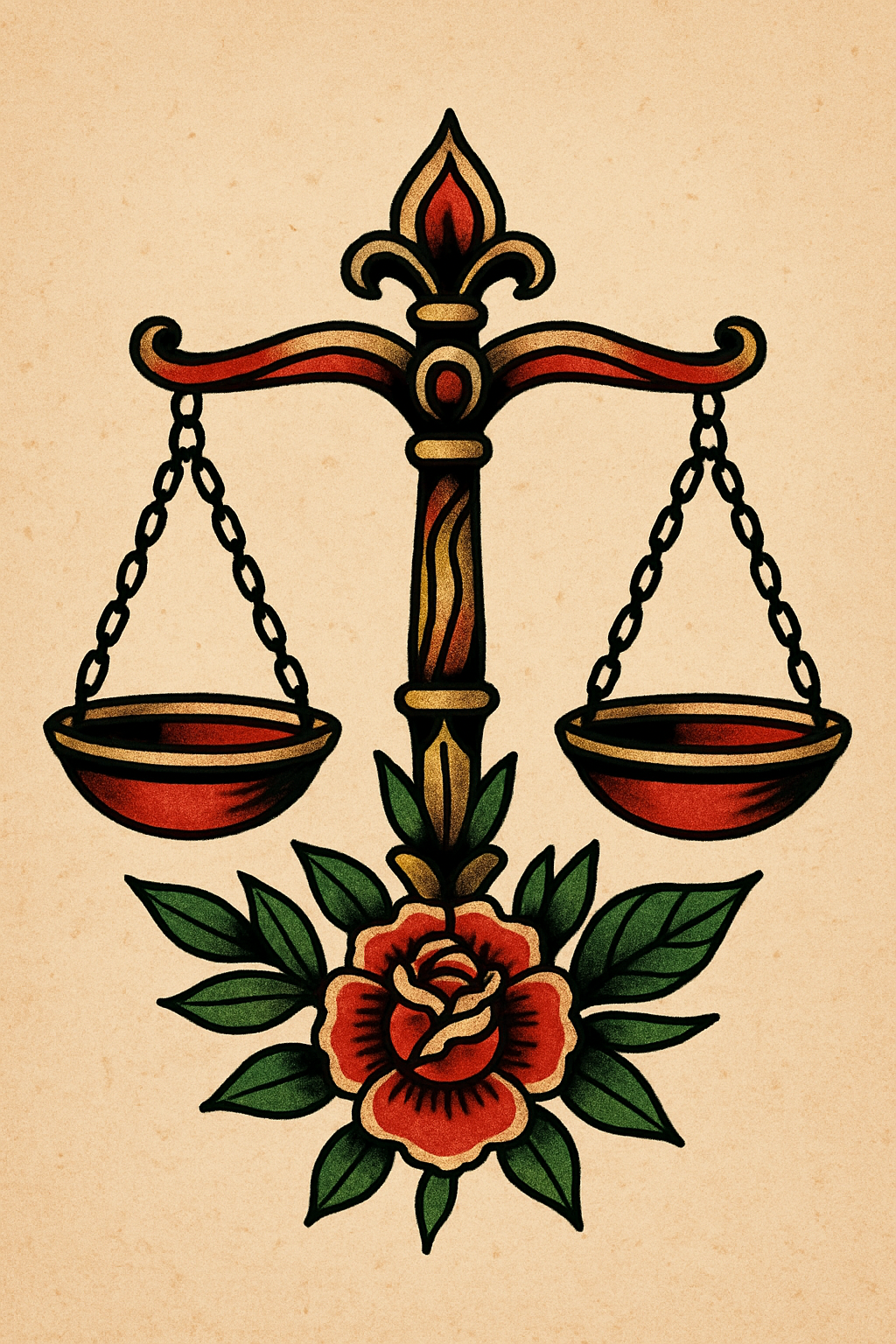 This image features a stylized tattoo design depicting scales of justice with a rose, combining elements of law and beauty. The vibrant colors and vintage style suggest a bold artistic expression.
