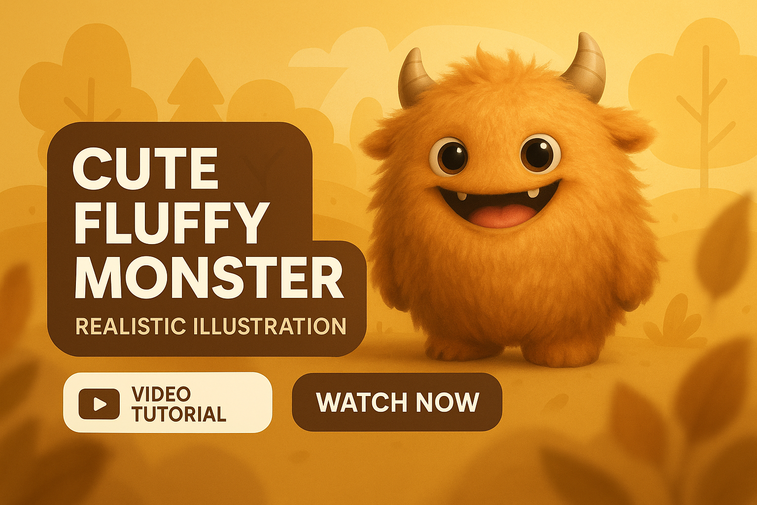 /Collection: /by davooda/Type: PNG/Charming illustration of a fluffy monster in a warm color palette, designed for a video tutorial. The graphic features playful elements and inviting typography, appealing to a family-friendly audience.