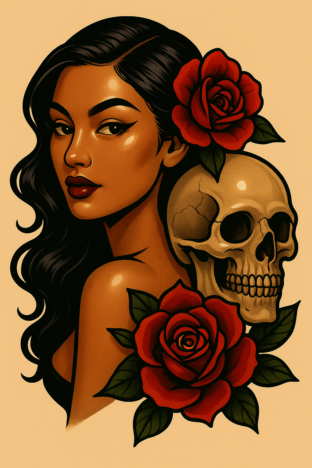 /Collection: /by davooda/Type: PNG/A striking tattoo-style illustration featuring a woman with dark flowing hair, adorned with roses and a skull, set against a soft beige background. The artwork combines classic tattoo elements with a glossy, anime-like finish.