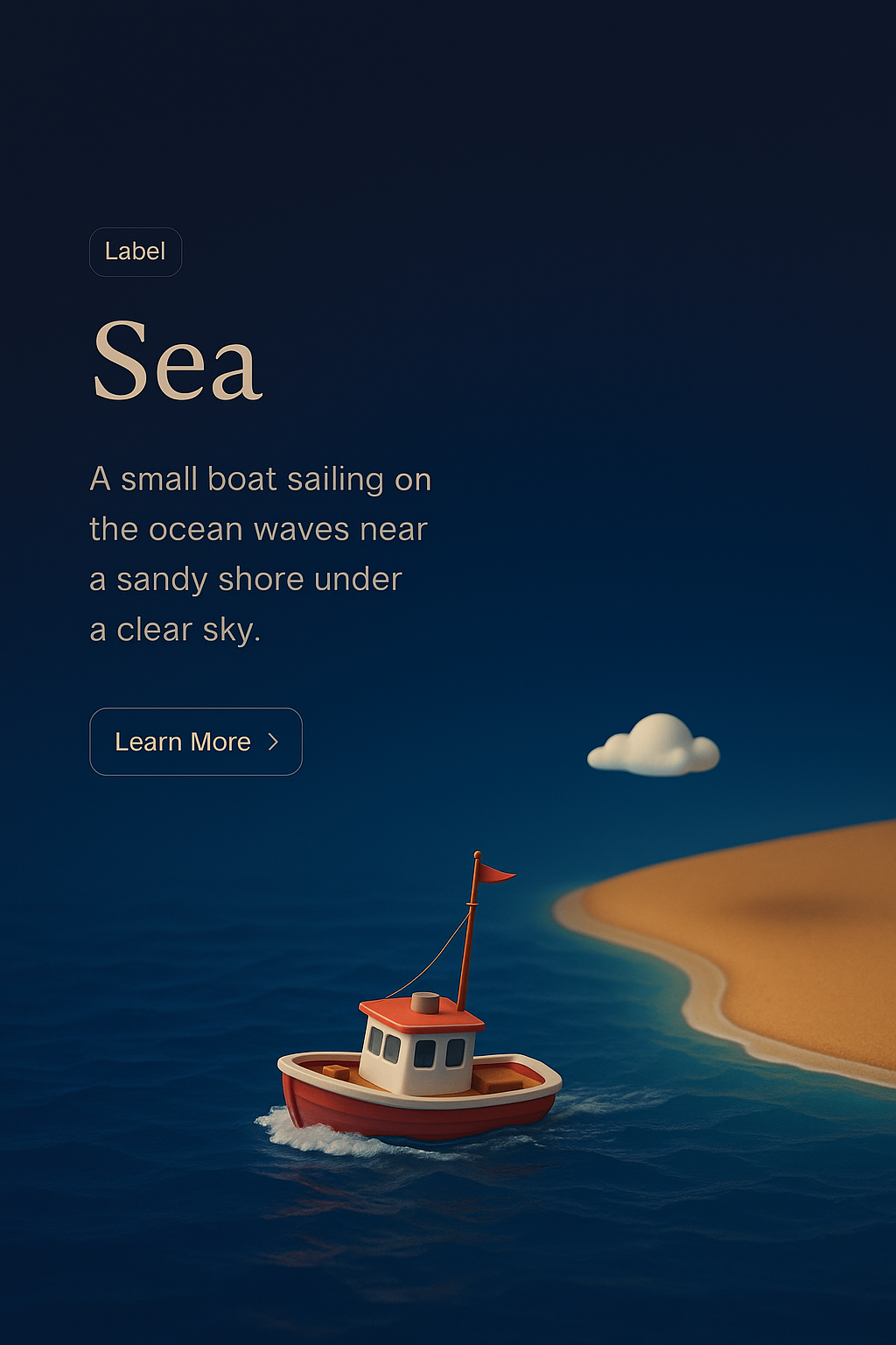 A tranquil 3D sea scene featuring a small boat sailing on ocean waves near a sandy shore under a clear sky. The background smoothly transitions from dark to light.