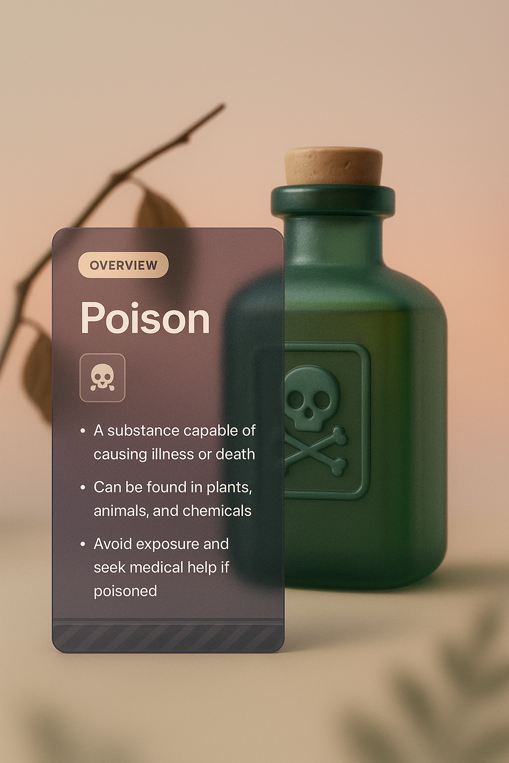 /Collection: /by davooda/Type: PNG/A 3D illustration featuring a stylized poison bottle with a skull emblem. Accompanying text blocks provide key information about poison. The design incorporates a smooth gradient background and a subtle glass effect.