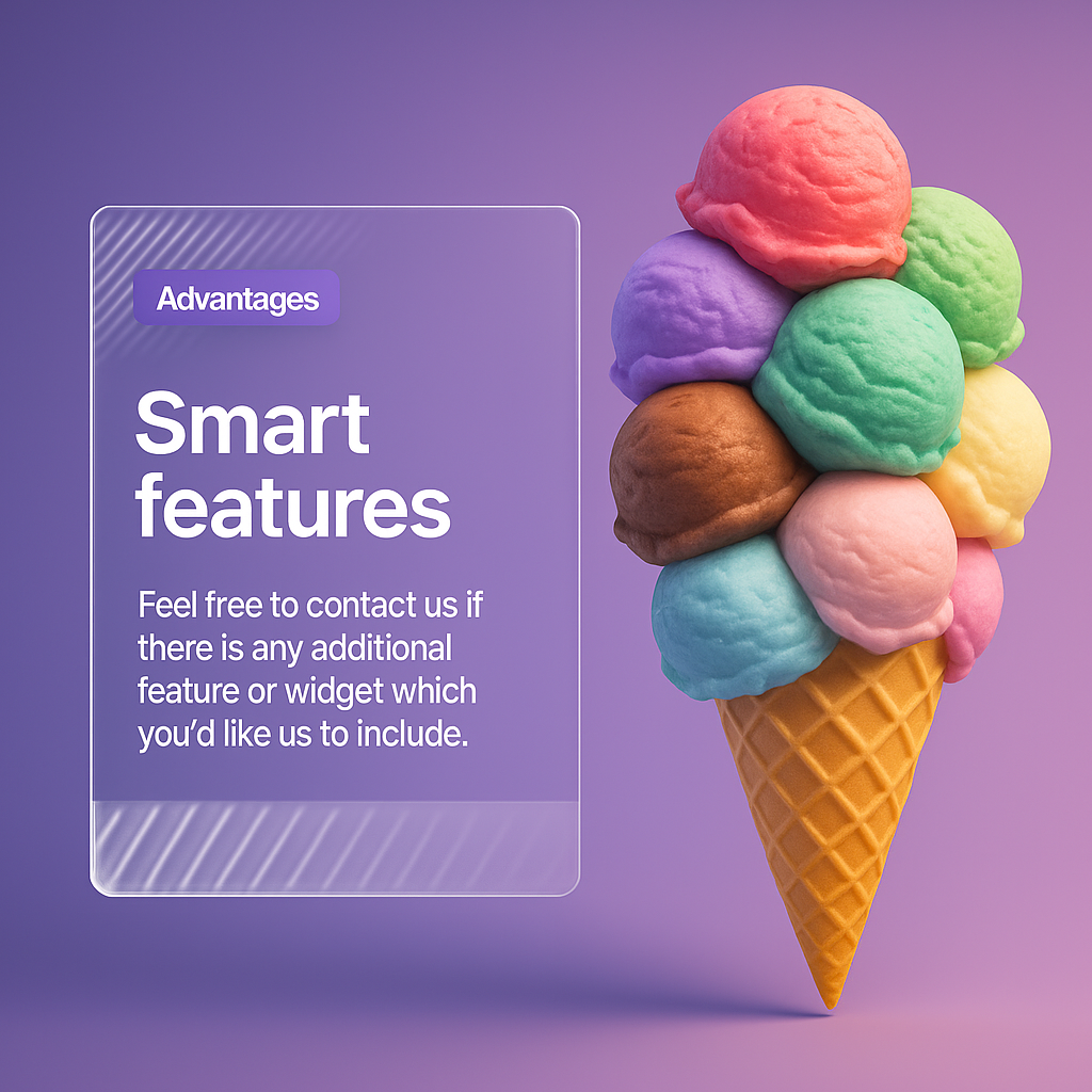 /Collection: /by davooda/Type: PNG/A vibrant 3D illustration of a waffle cone topped with multiple colorful ice cream scoops. Accompanied by a transparent feature block highlighting smart features.