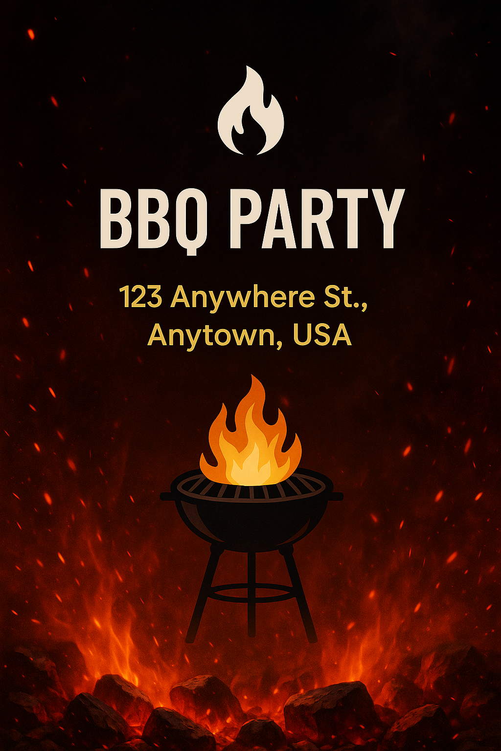 /Collection: /by davooda/Type: PNG/Stylish BBQ party invitation graphic featuring a barbecue grill and flames, perfect for casual summer gatherings or outdoor events. Bold typography enhances the festive theme.