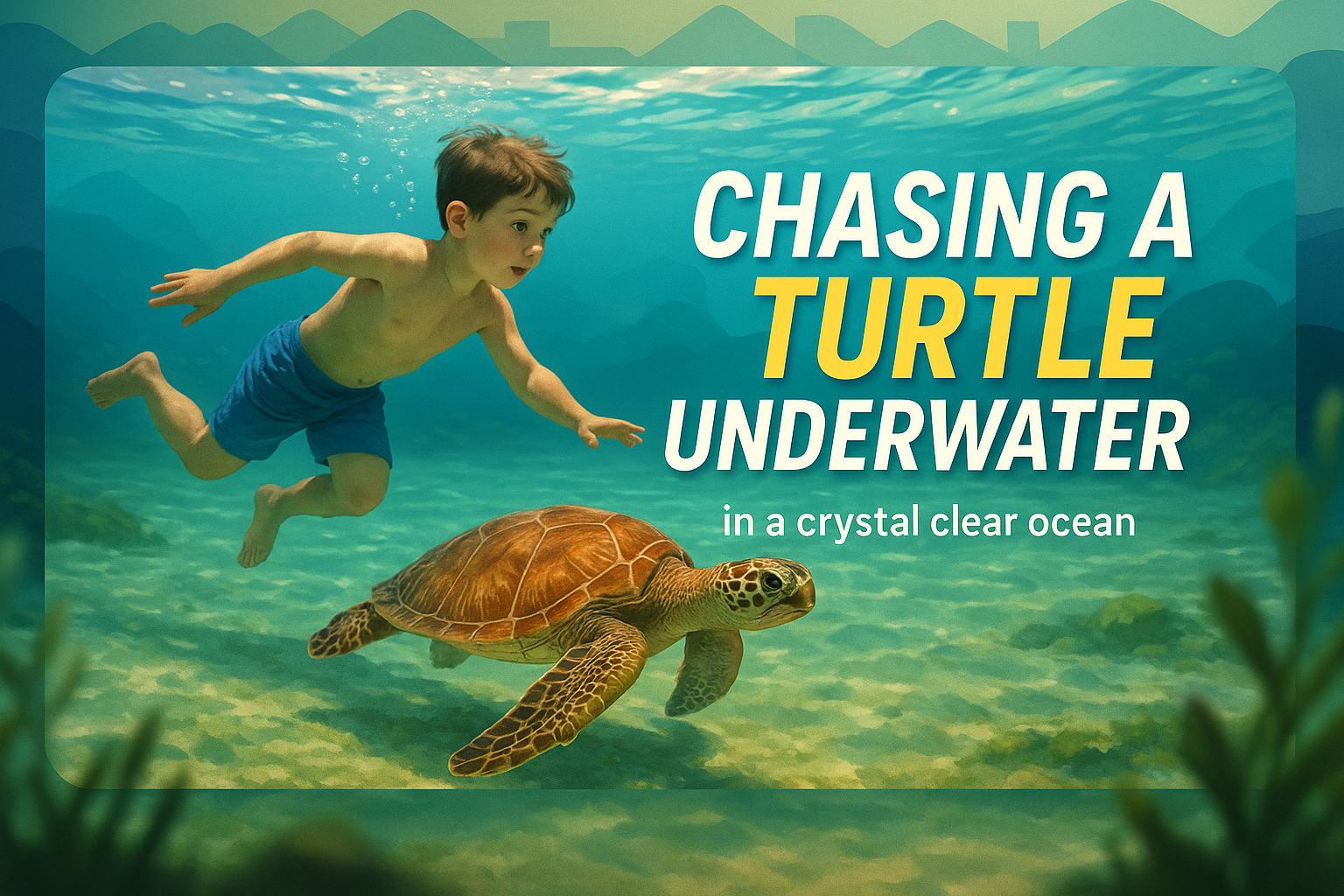Underwater Scene of a Child Chasing a Turtle in Clear Ocean