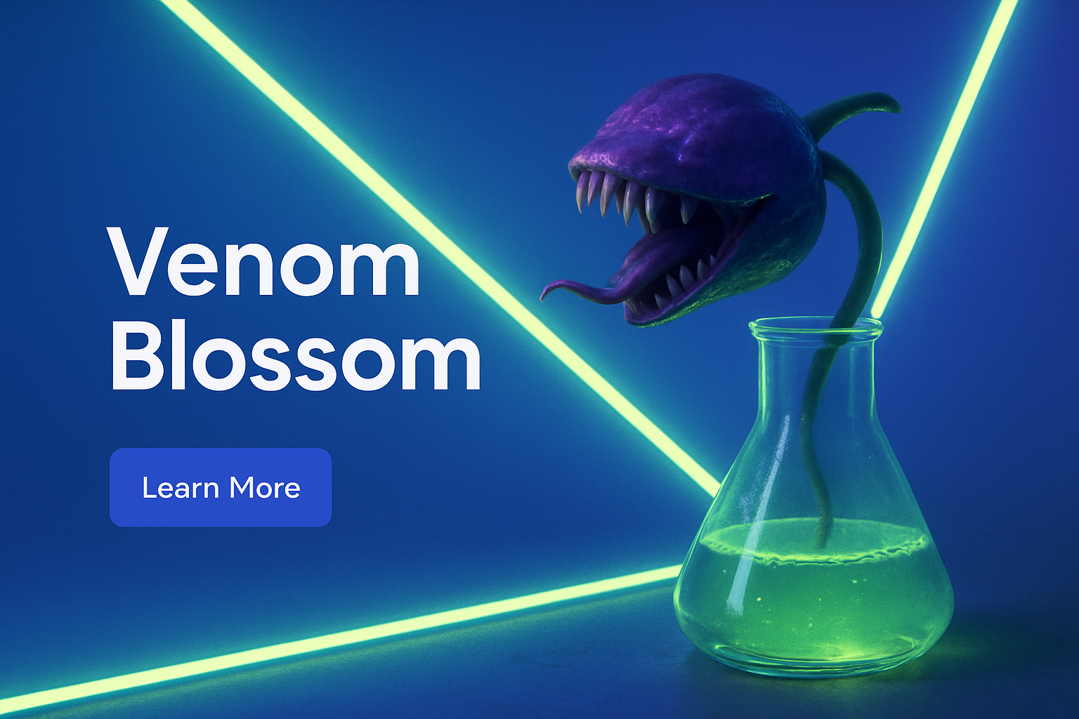 /Collection: /by davooda/Type: PNG/A striking depiction of a venomous flower emerging from a glass beaker, illuminated by vibrant neon lights. The scene features a blend of light yellow-green, solid blue, and violet hues, creating a captivating atmosphere.