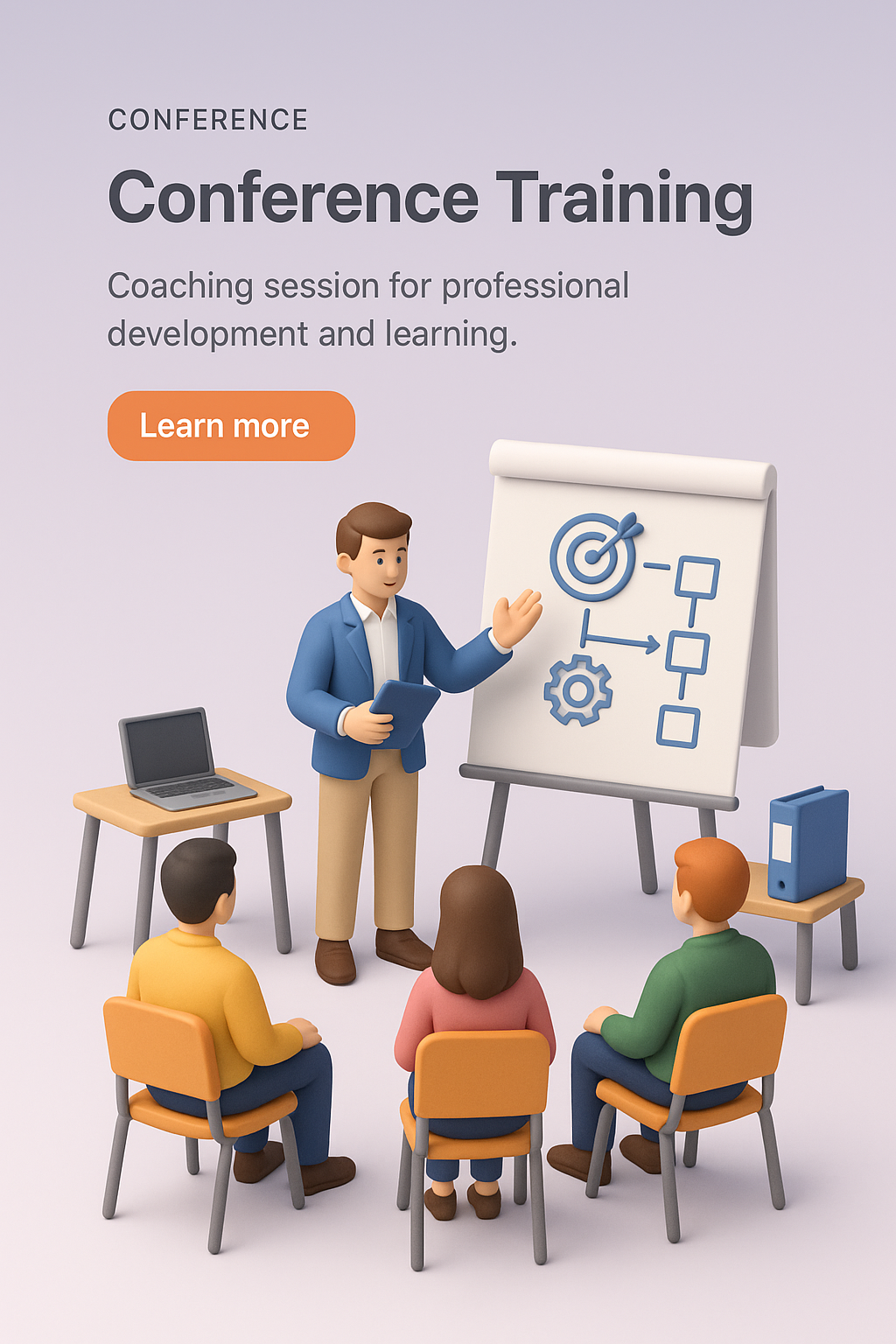 A 3D illustration depicting a conference training session with a presenter and audience. The scene features a projector screen, charts, and participants engaged in discussion.
