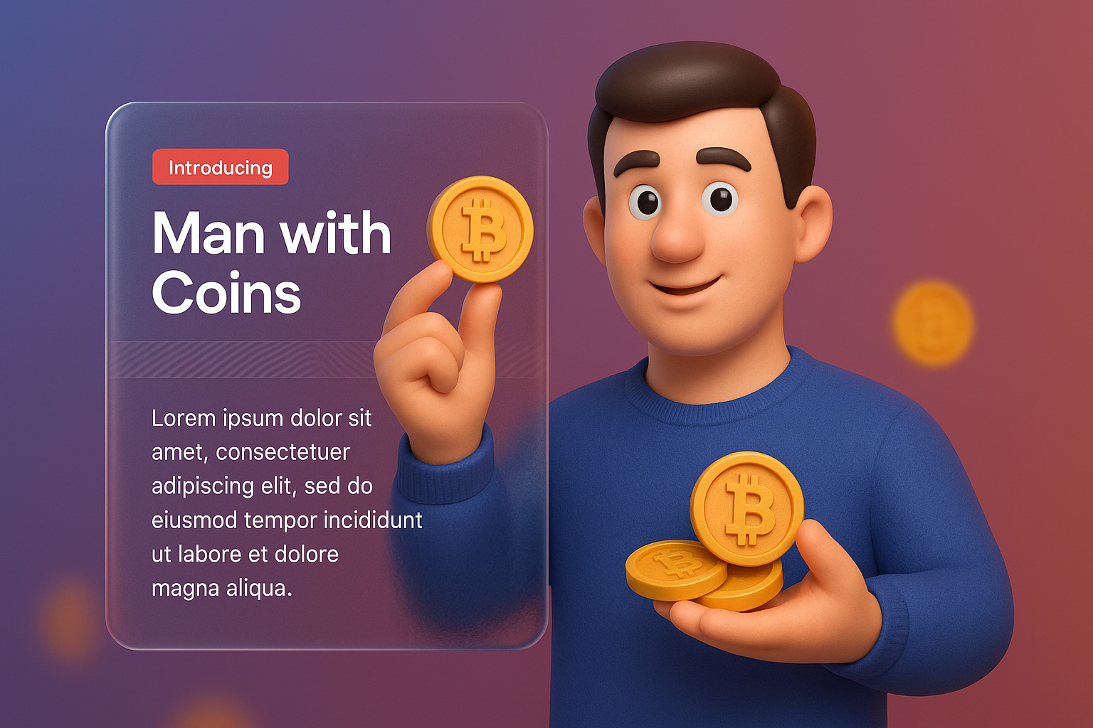 A 3D character is shown holding coins with a Bitcoin symbol, set against a smooth gradient background. The design features text elements in a transparent block, enhancing the modern crypto theme.