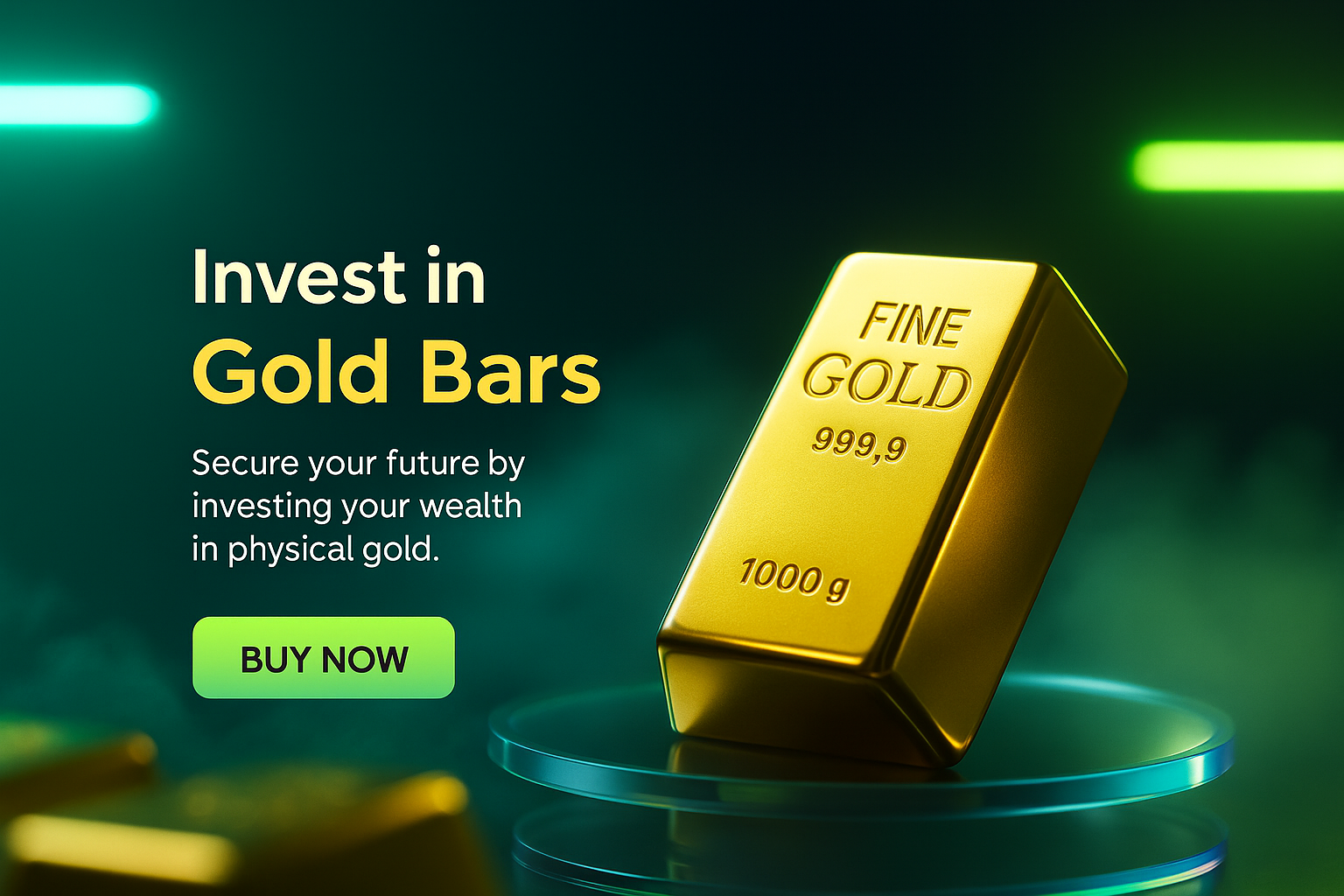 /Collection: /by davooda/Type: PNG/A visually striking carousel slide design featuring a realistic gold bar with neon accents, promoting investment in physical gold. The text emphasizes security and wealth.