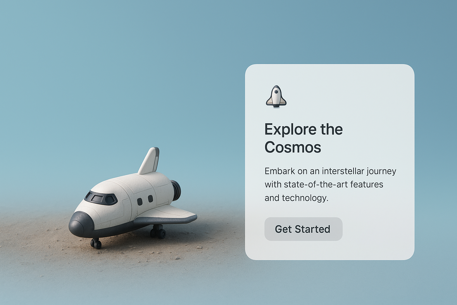 A detailed yet simple 3D scene featuring a spaceship icon against a smooth gradient background, complemented by a text block and action button, all designed for a cohesive visual appeal.