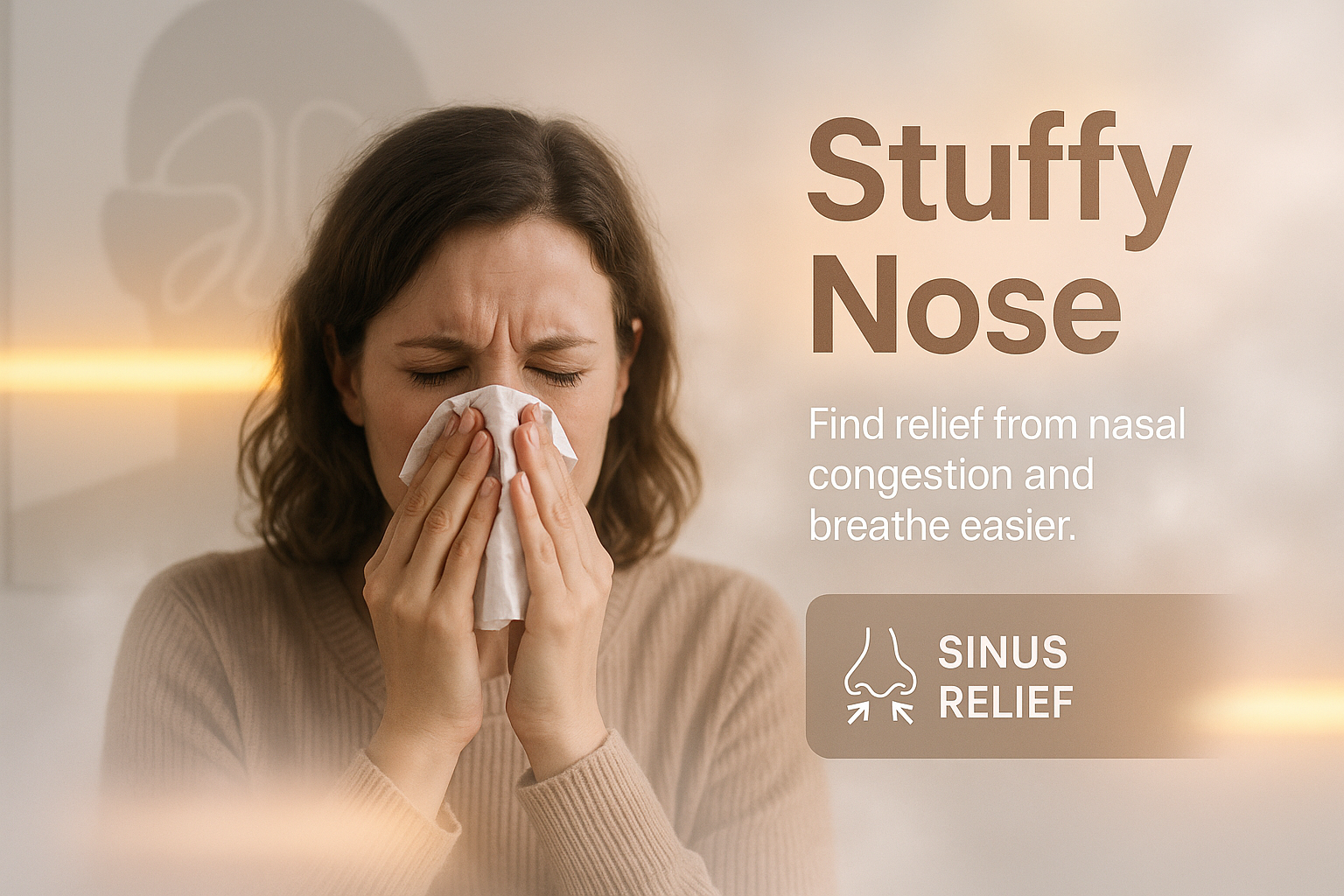Informative health graphic showcasing a woman experiencing nasal congestion, designed to promote sinus relief solutions. Ideal for healthcare marketing.