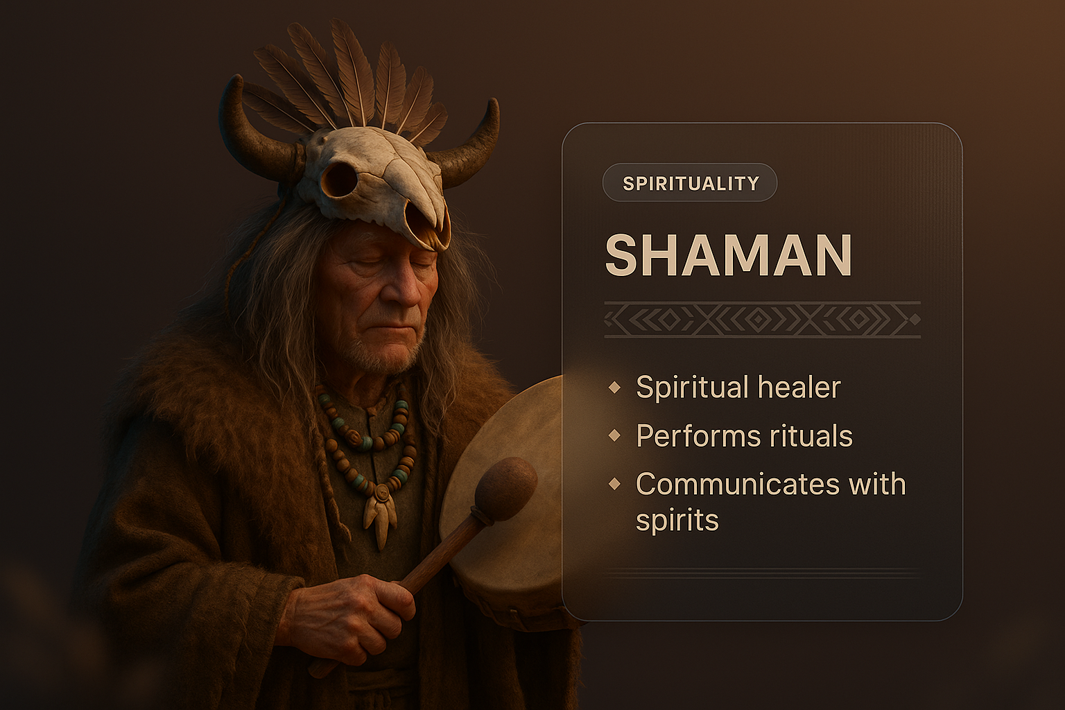 A 3D illustration of a shaman holding a drum, featuring a layered design with a gradient background and integrated text blocks for a web layout.