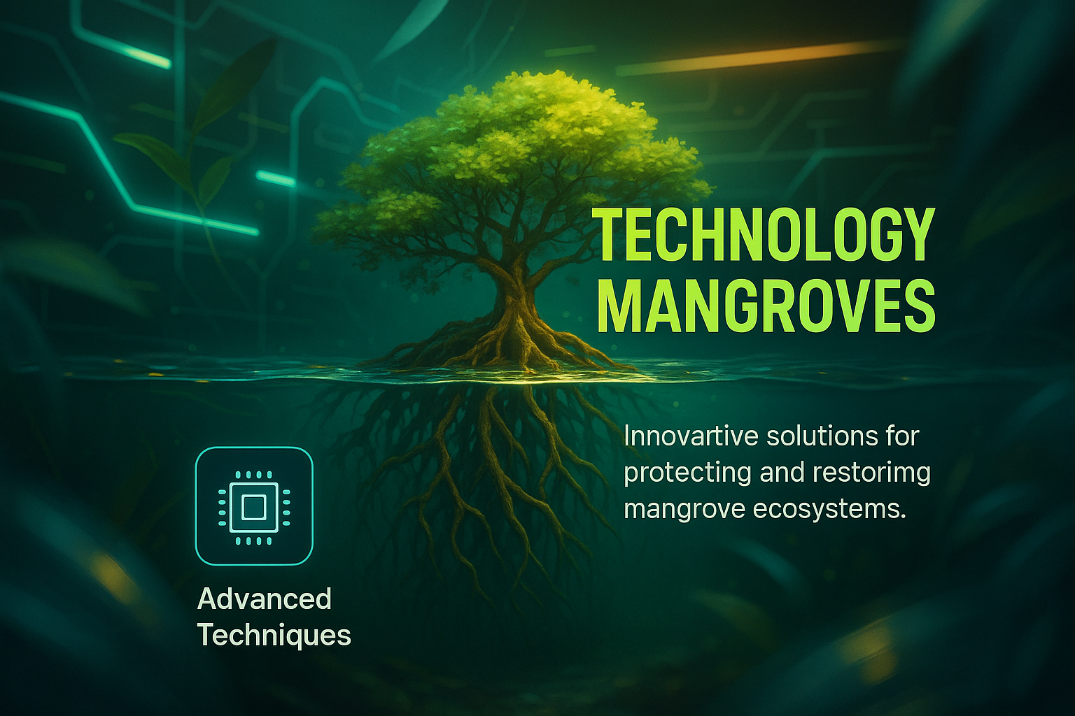/Collection: /by davooda/Type: PNG/A visually striking graphic showcasing the intersection of technology and mangrove ecosystem conservation. The design features a tree with roots submerged in water, symbolizing innovative solutions for environmental protection.