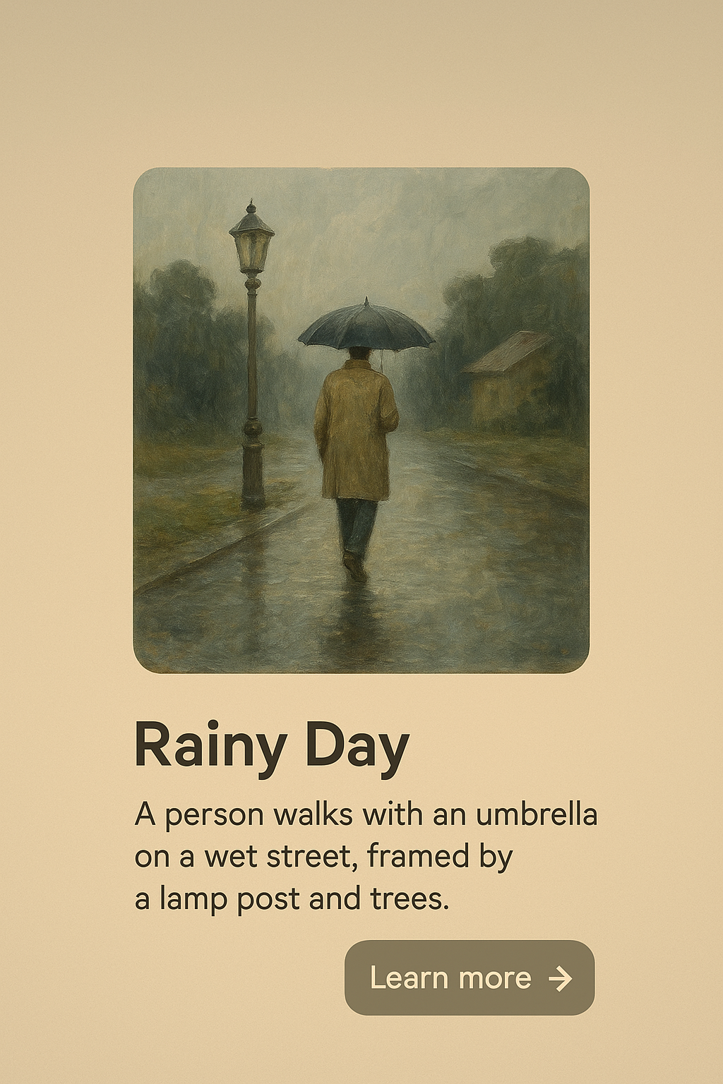A detailed oil painting depicting a person walking with an umbrella on a wet street. The scene is framed by a lamp post and trees, capturing the essence of a rainy day.