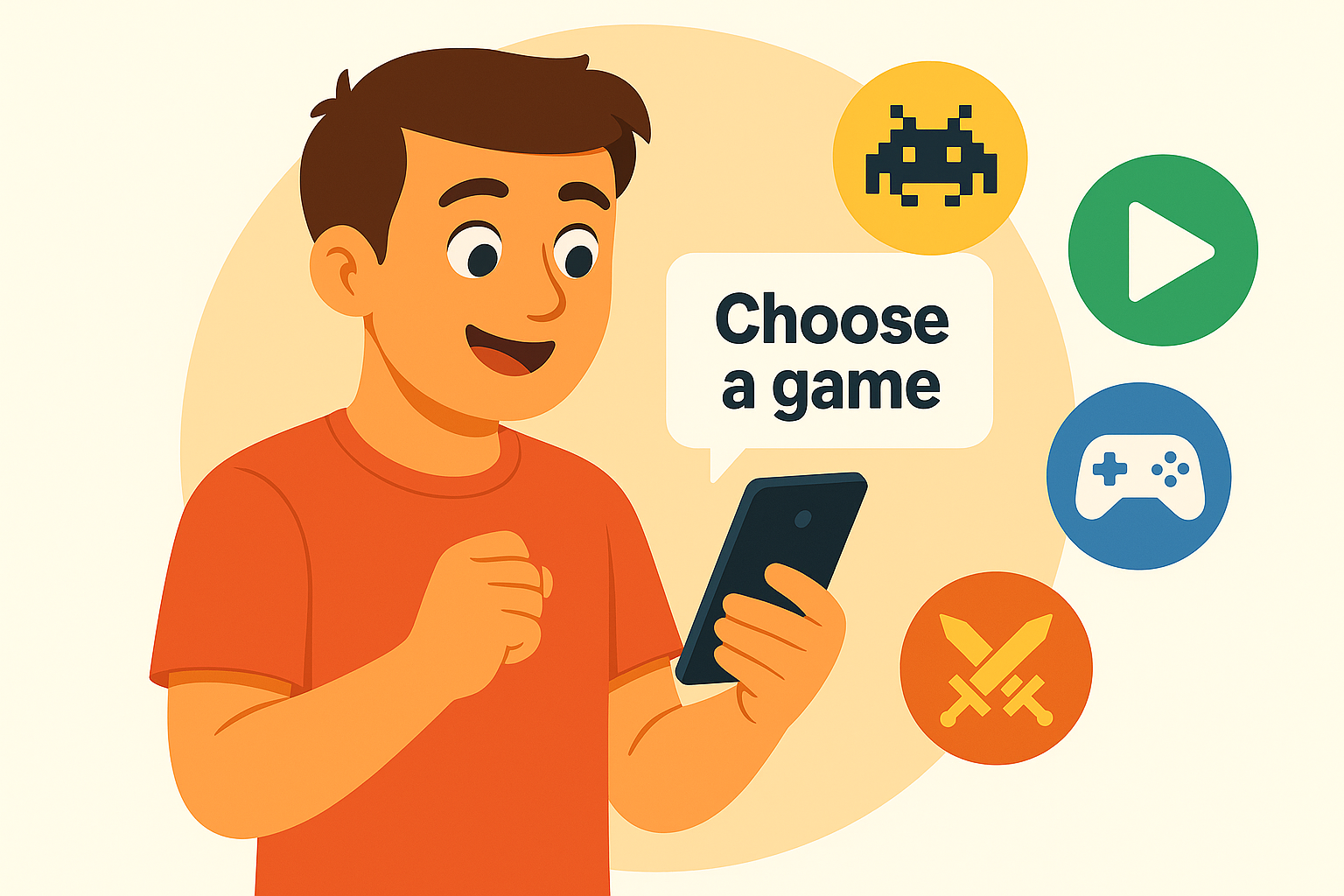 Playful Illustration of a Gamer Choosing a Mobile Game