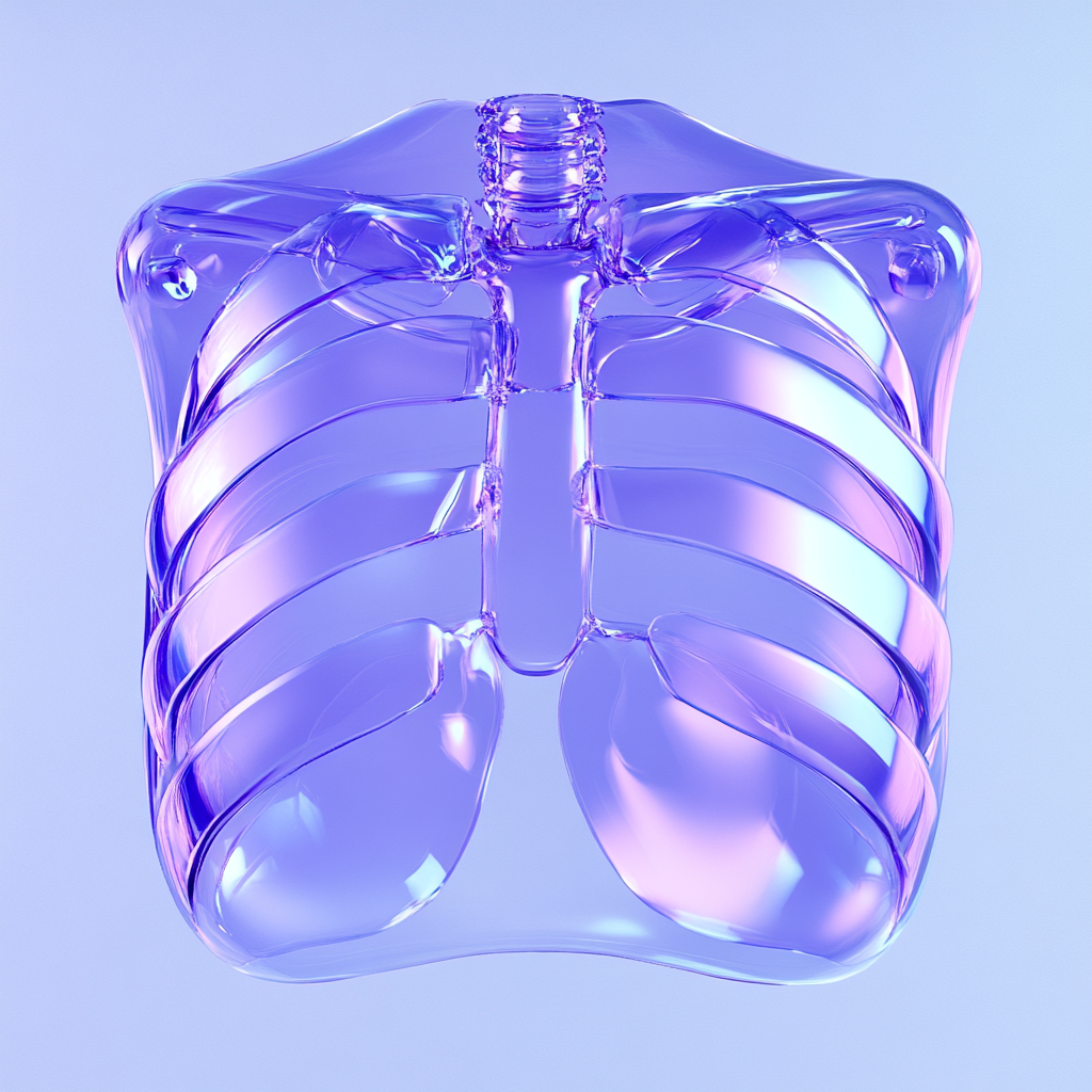 A visually striking 3D model of a ribcage rendered in translucent materials with glowing purple hues. Ideal for educational or medical illustration purposes.