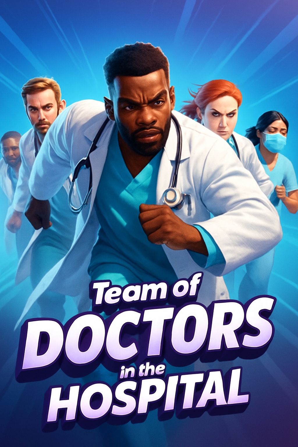 A vibrant and dynamic scene featuring a diverse team of doctors in hospital attire, running with determination. The background showcases a smooth gradient, enhancing the urgency and energy of the composition.