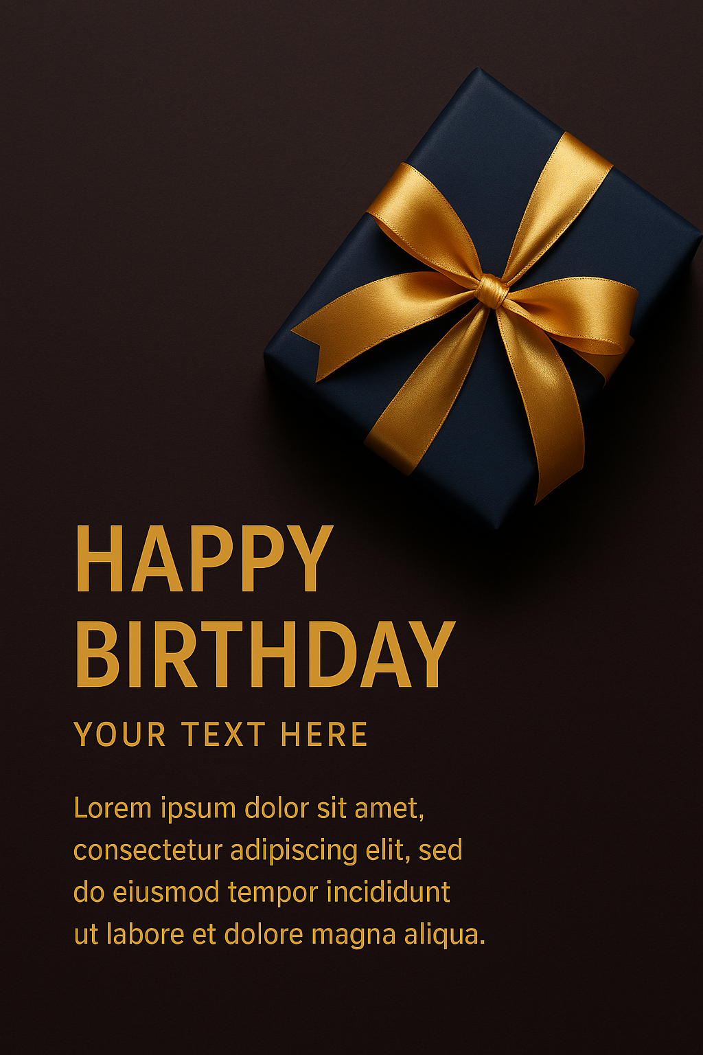 A visually appealing image of a dark blue gift box adorned with a golden ribbon, suitable for birthday celebrations and invitations. The design is elegant, emphasizing a festive theme.