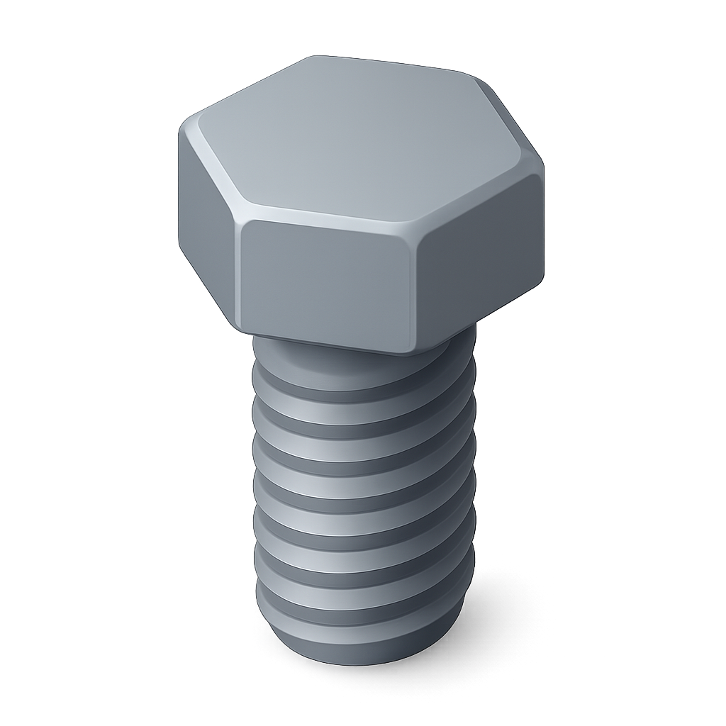 A sleek, 3D-rendered bolt icon showcasing a hexagonal head and threaded body, presented in a three-quarter isometric view against a subtle gradient background.