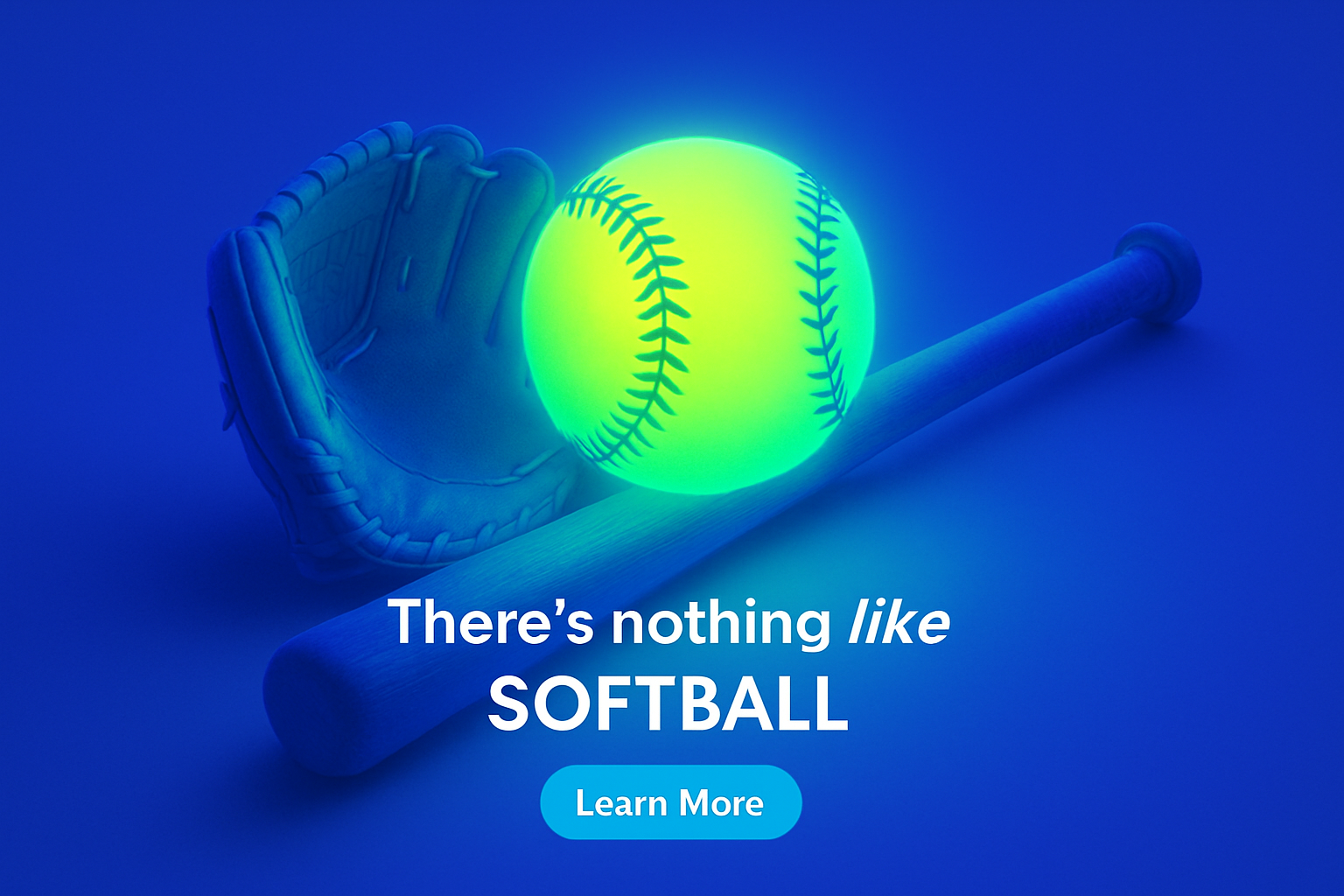 The image presents a glowing softball alongside a bat and glove, set against a solid blue background. The softball emits a bright, light yellow-green glow, creating a captivating atmosphere.