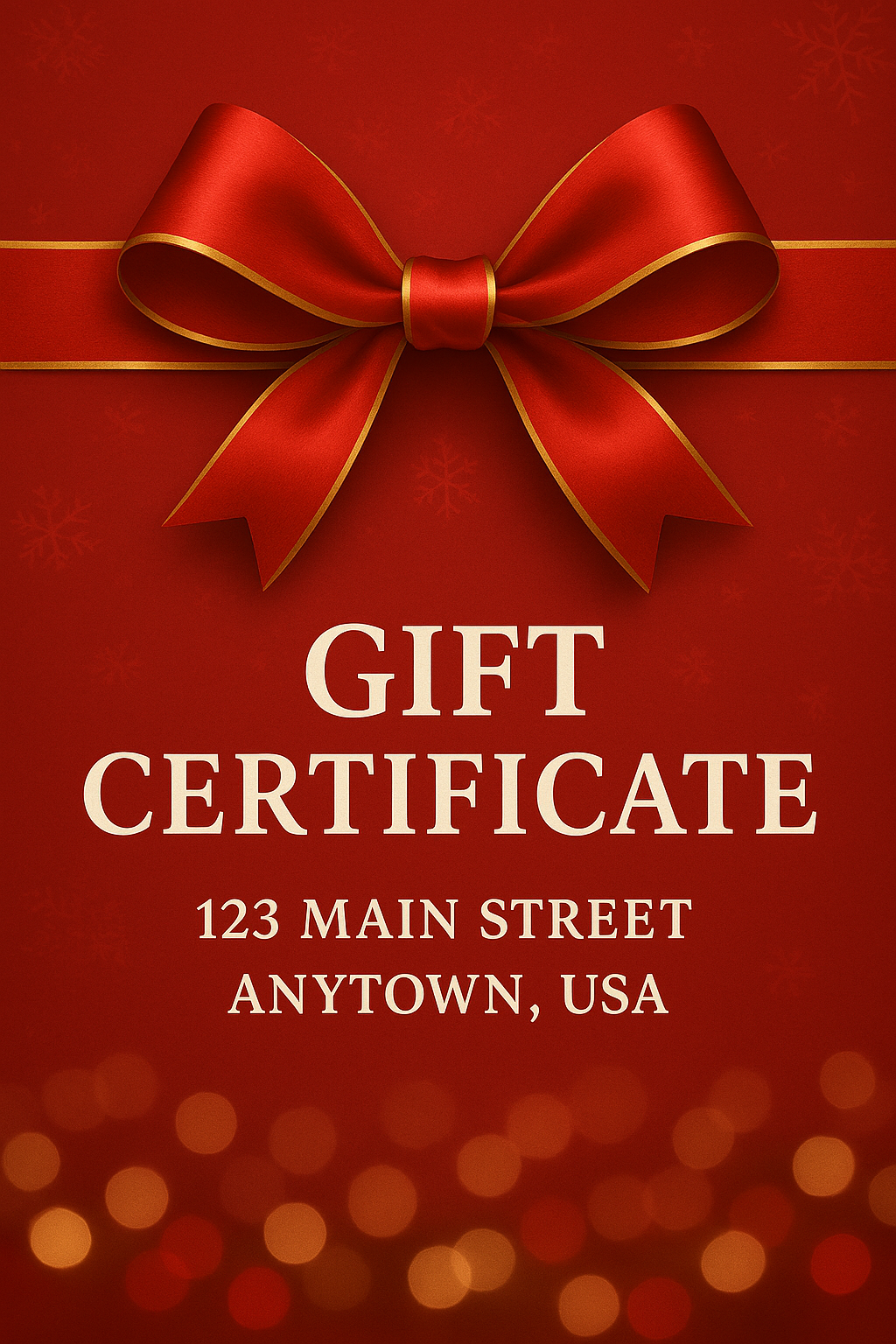 Luxurious gift certificate graphic featuring a red background with a decorative bow, ideal for retail or service businesses looking to offer presents.