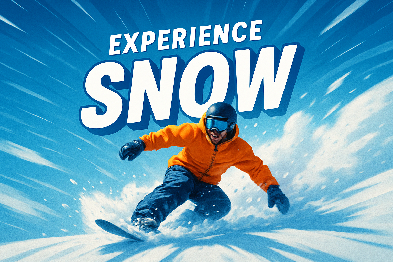 A thrilling snowboarding moment captured with a dynamic angle, showcasing a rider in motion. The bold text 'EXPERIENCE SNOW' emphasizes the excitement, set against a vibrant blue background.