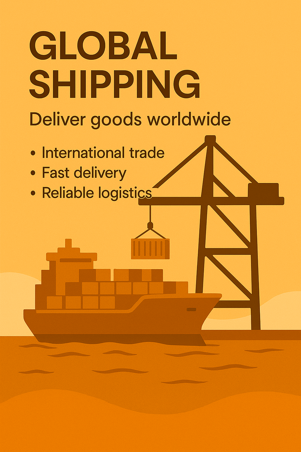 Stylized graphic representing global shipping services, featuring a cargo ship and crane. Ideal for logistics companies or international trade promotions.