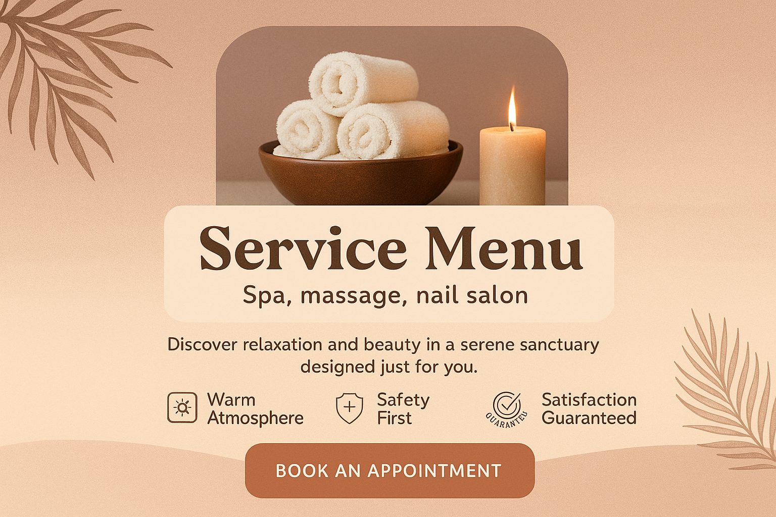 A serene boho-inspired service menu showcasing spa, massage, and nail salon offerings. The design features a calming color palette with soft gradients and a warm atmosphere.