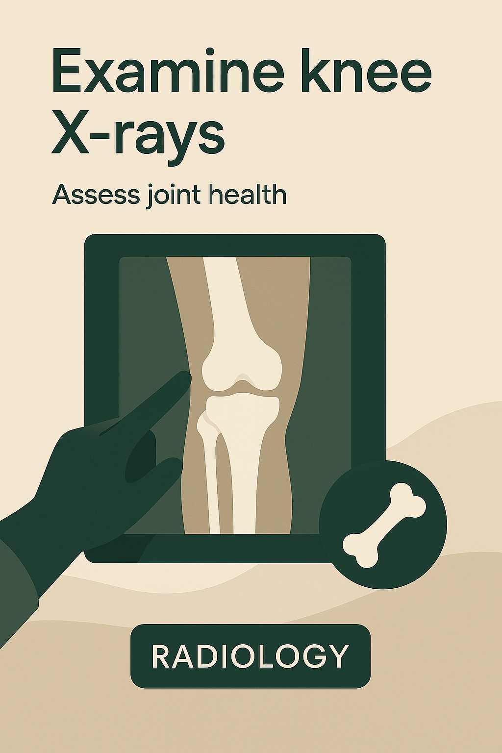 Informative graphic focused on knee X-ray examination, featuring a simplified illustration and a modern design style suited for medical education.